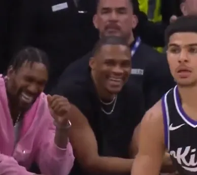 美国篮球媒体Hoop Central晒出比赛中鲍尔三分投进后看向替补席的威斯布鲁克,随后威斯布鲁克在替补席开怀大笑。